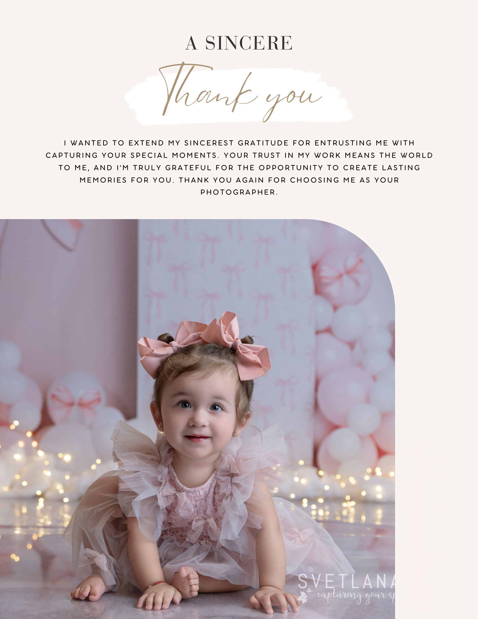 We have worked with Svetlanta for many years now, including many of our family's special milestone moments such as our annual photo shoot, our babyās cake smash, and most recently for our daughter's first birthday event. Her eye for capturing the perfect moment is truly unmatched and her dedication to continuously mastering her craft is evident in every session. What truly sets her apart is how deeply she cares ā she patiently works through edits and refinements to make sure the final photos truly reflect our vision and that every detail is right. Our children are always so comfortable with her; she is incredibly patient and never rushes the process, understanding how important it is to give families the time they need to feel at ease so she can capture the best, most genuine smiles. We deeply admire her professionalism, flexibility, and exceptional editing skills and always look forward to working with her.